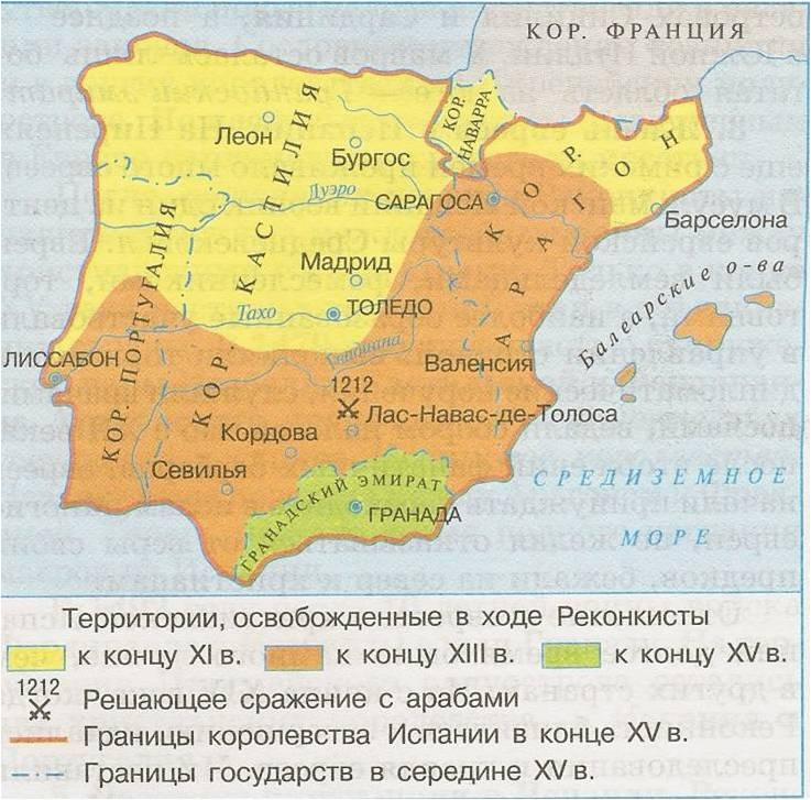 Цель.Возвращение земель христианами (испанцами, португальцами), захваченные мусульманами (маврами, арабами).Также в этом длительном процессе принимали участие феодалы, крестьяне, города, рыцари, церковнослужители.Для феодалов главная цель была завоевание новых земель и получение новых должностей, для крестьян получение земель и личной неприкосновенности (свободы), для городов получение самоуправления, для рыцарей получение чести (славы) и новых земель, для церковнослужителей (папа римский) призвание крестьян к Крестовым походам против мавров для получения новые земли.