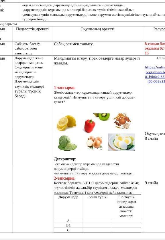 Жеміс жидектерде А, В, С дәрумендері және қанды көбейту үшін С дәрумені қажет. Ол алма, қызанақ, қызылшада болады.