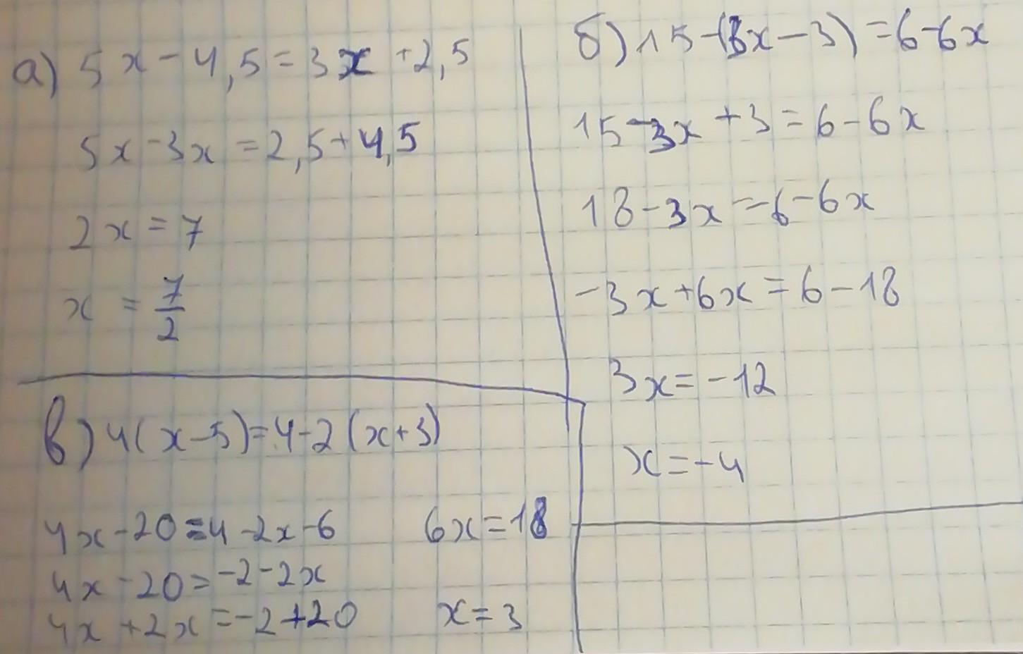 в) 4 • (х - 5) = 4 - 2 • (х + 3)