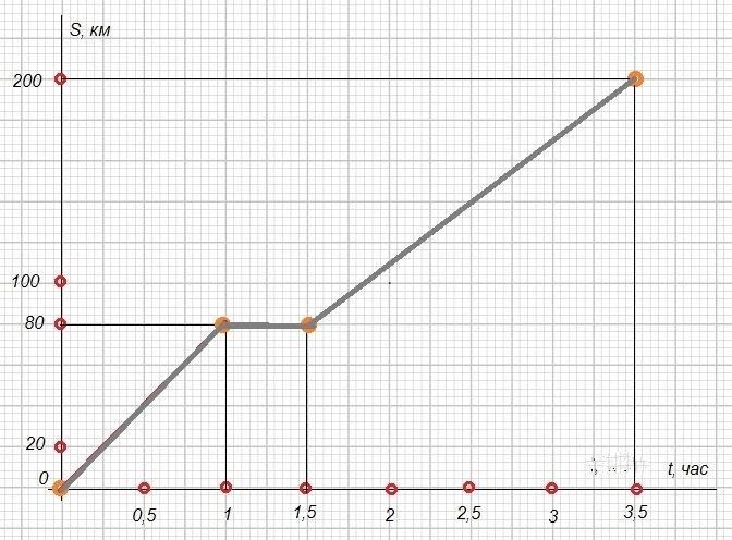 автомобиль ехал 1 ч со скоростью 80 км/ч затем 0.5 ч стоял, а потом ехал 2 ч со скоростью 60км/ч. Постройте график зависимости скорости от времени.