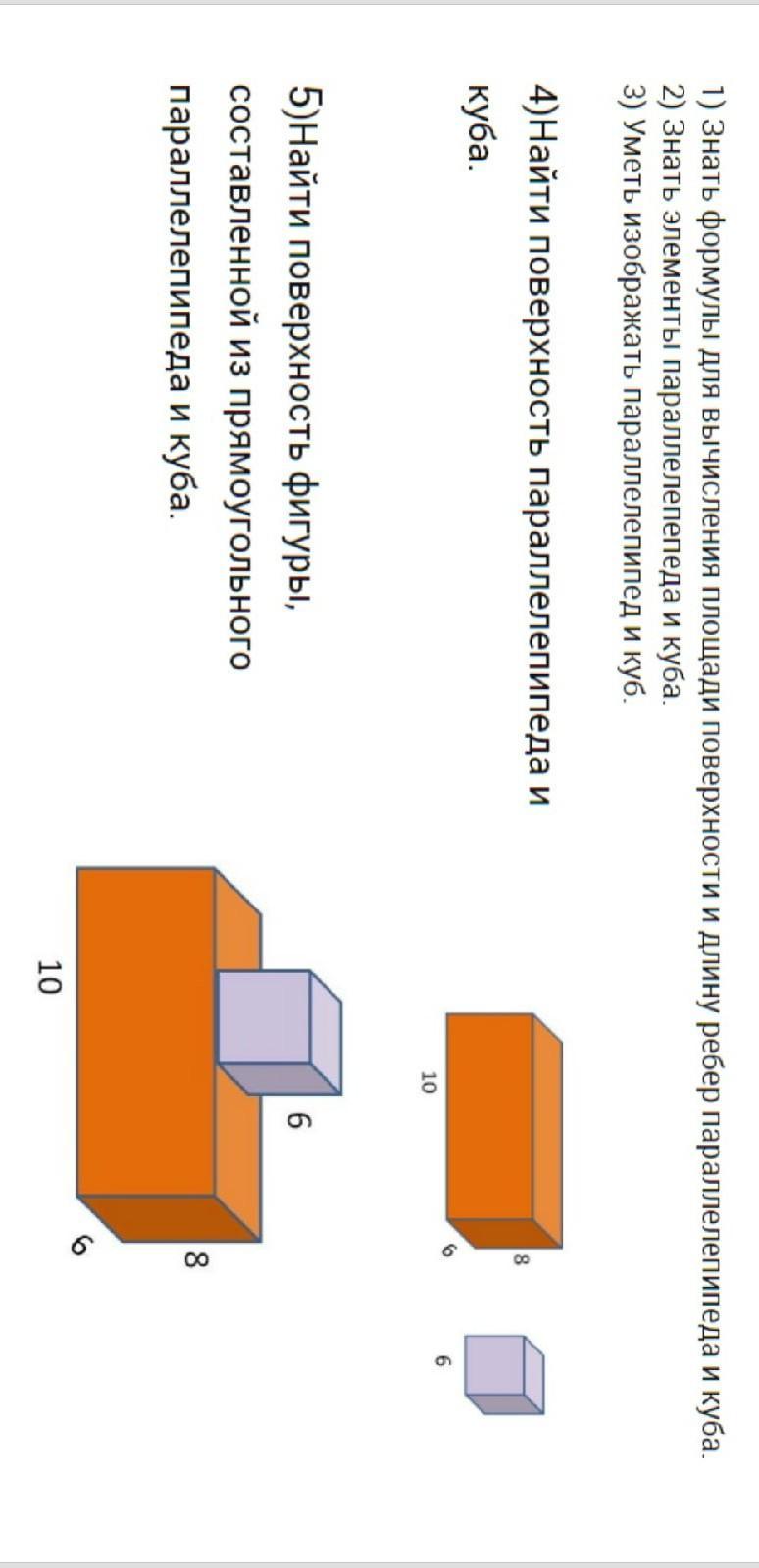 3) Площадь поверхности фигуры будет состоять из суммы площадей поверхности этих фигур в отдельности, минус площадь поверхности одной грани куба, которой он соприкасается с параллелепипедом и минус такой же площади поверхности параллелепипеда, которой он соприкасается с кубом: