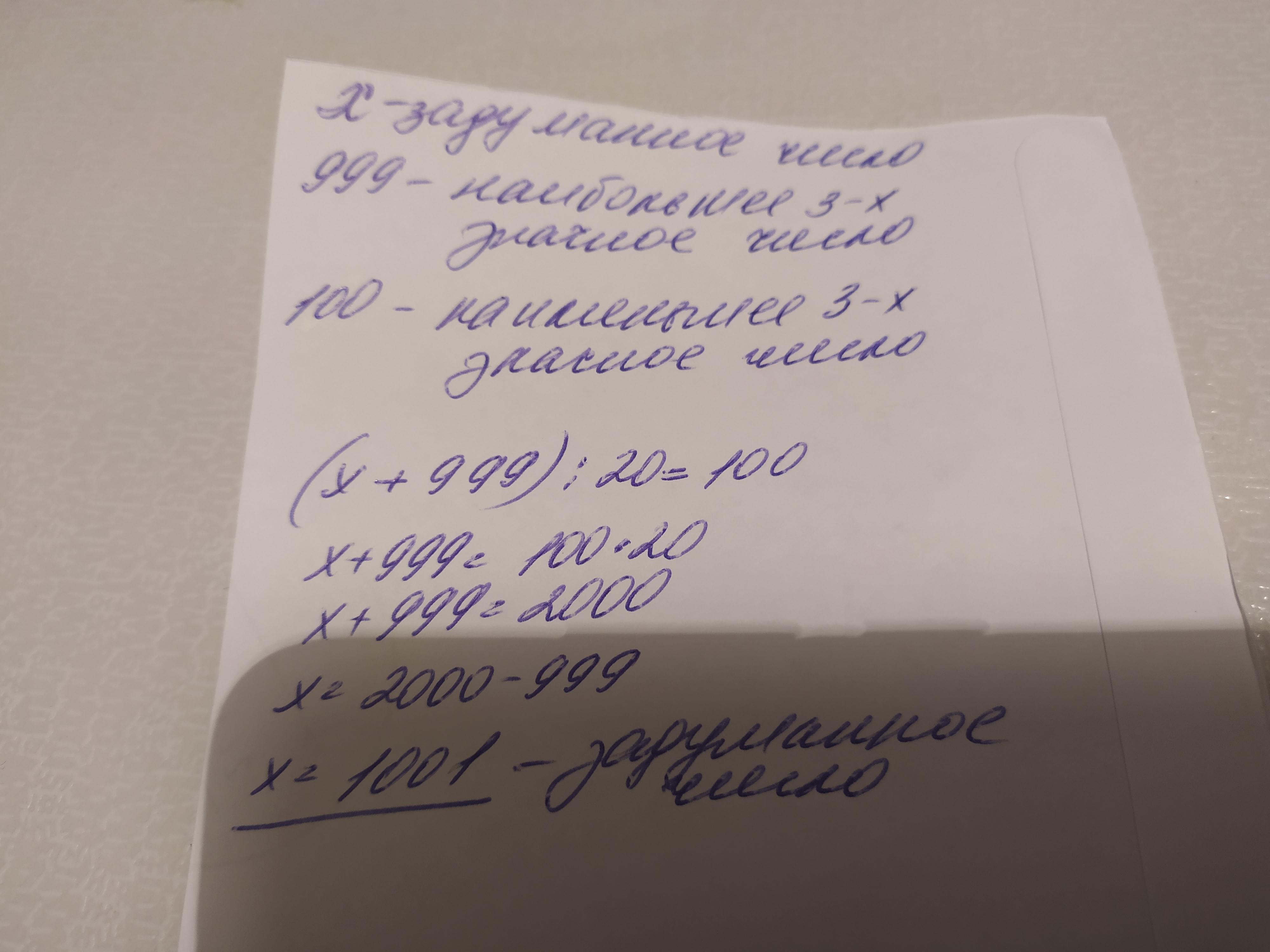 Вася задумал число. Он прибавил к нему наибольшее трёхзначное число, результат разделил на 20 и получил наименьшее трёхзначное число какое число задумал Вася? и Можно плиз обозначить все знаки?Типо если дробь то так и пишем дробь|