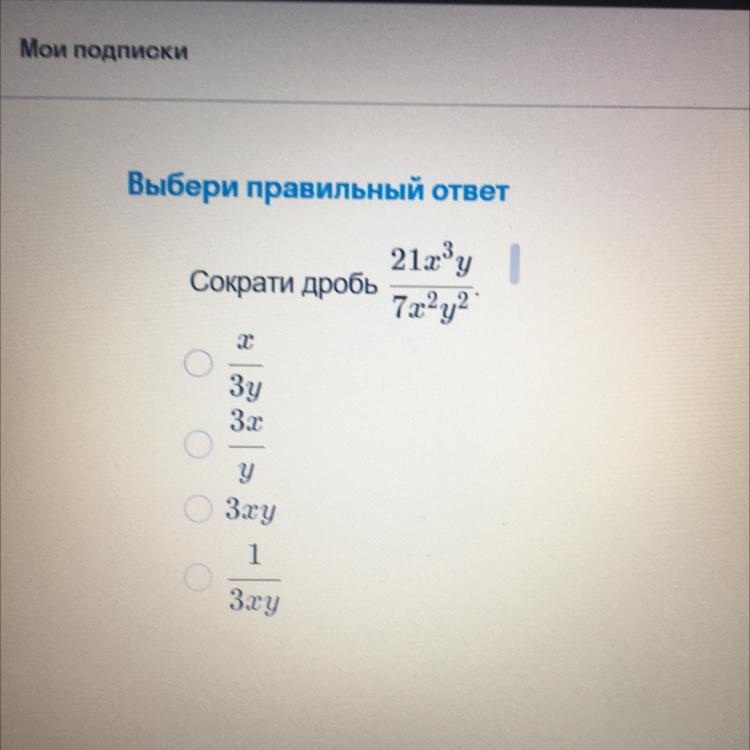 \displaystyle \frac{21x^3y}{7x^2y^2} =\frac{3x^3y}{x^2y^2}=\frac{3xy}{y^2} =\boxed{\frac{3x}{y} }