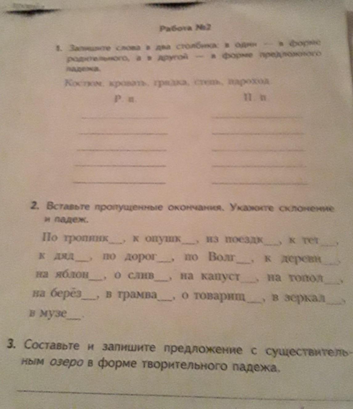 2. По тропинке (д.п., 1 скл), к опушке (д.п., 1 скл), из поездки (р.п., 1 скл), к тёте (д.п., 1 скл), к дяде (д.п., 1 скл), по дороге (д.п., 1 скл), по Волге (д.п., 1 скл), к деревне (д.п., 1 скл), на яблоне (пр.п., 1 скл), о сливе (пр.п., 1 скл), на капусте (пр.п., 1 скл), на тополе (пр.п., 2 скл), на берёзе (пр.п., 1 скл), в трамвае (пр.п., 2 скл), о товарище (пр.п., 2 скл), в зеркале (пр.п., 2 скл), в музее (пр.п., 2 скл).