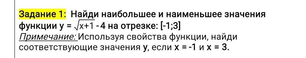 данная функция - монотонно возрастающая на всей области определения (при увеличении х, увеличивается у) => наименьшее значение в точке х = -1 => y = -4, а наибольшее в х = 3 => y = -2