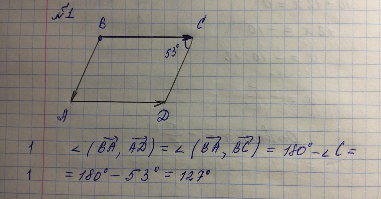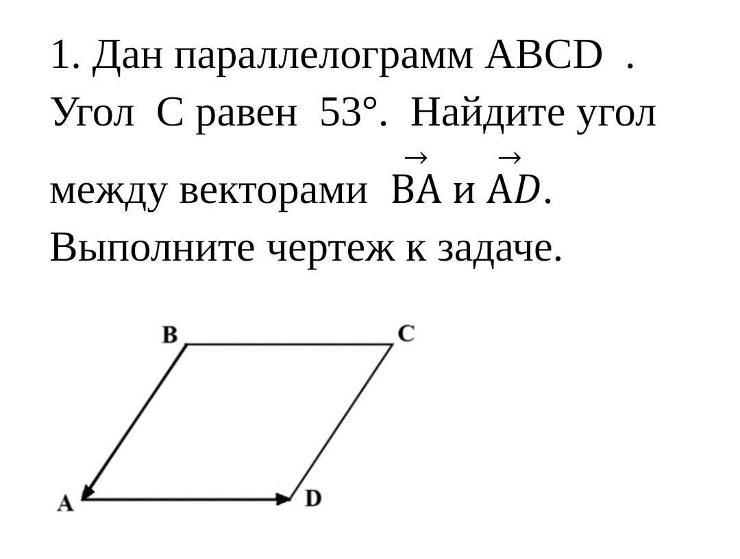 Дан параллелограмм ABCD . Угол C равен 53°. Найдите угол между векторами ВА и АD. Выполните чертеж к задаче.