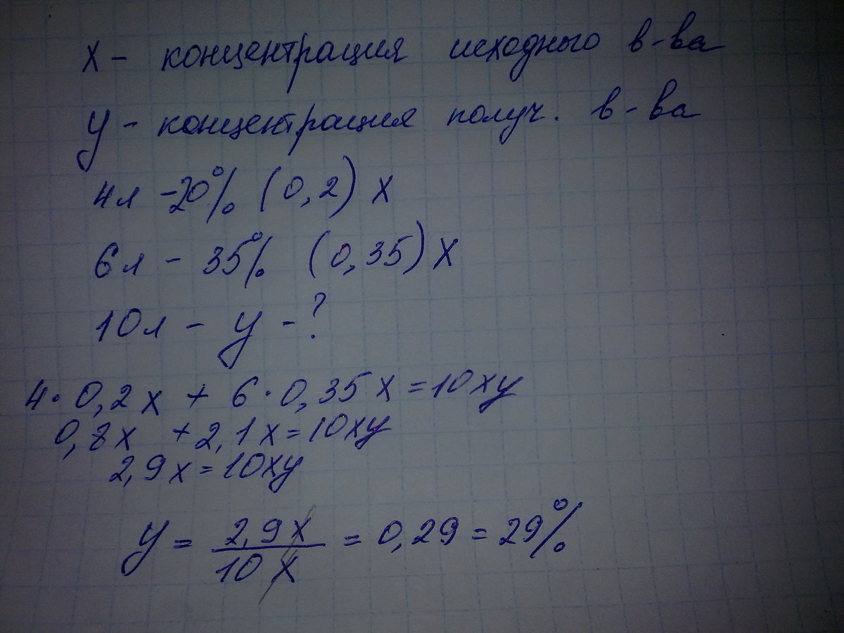 смешали 4л 20% водного раствора некоторого вещества с 6л 35% водного раствора этого же вещества. сколько % составляет концентрация получившегося раствора?? помогите пожалуйста)