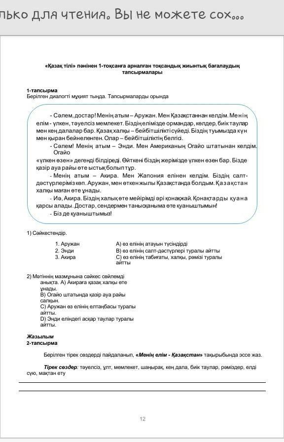 Менің туып, өскен жерім –Егемен ел Қазақстан. Қазақстан тәуелсіз, жері кең, ұлан байтақ, егеменді ел. Қазақстан жерінің асты да, үсті де бай. Асты бай дегенім-көптеген қазба байлықтары, ал, үсті бай дегенім-Қазақстан жеріндегі бейбіт, аспаны ашық, қырандай самған, өмір сүріп жүрген қазақтарым.Менің ойымша, болашақта Қазақстан ең дамыған елдердің алдында тұрады. Гүлденген, көркейген мемлекет боларына ешбір шүбәм жоқ. Мен өз Қазақстанымдай байтақ елімді мақтан тұтамын! Қазақ болғаныма қуанамын