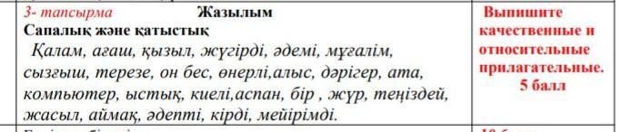Сапалық және қатыстық Қалам , ағаш , қызыл , жүгірді , әдемі , мұғалім , сызғыш , терезе , он бес , өнерлі , алыс , дәрігер , ата , компьютер , ыстық , киелі , аспан , бір , жүр , теңіздей кірді , мейірімді .