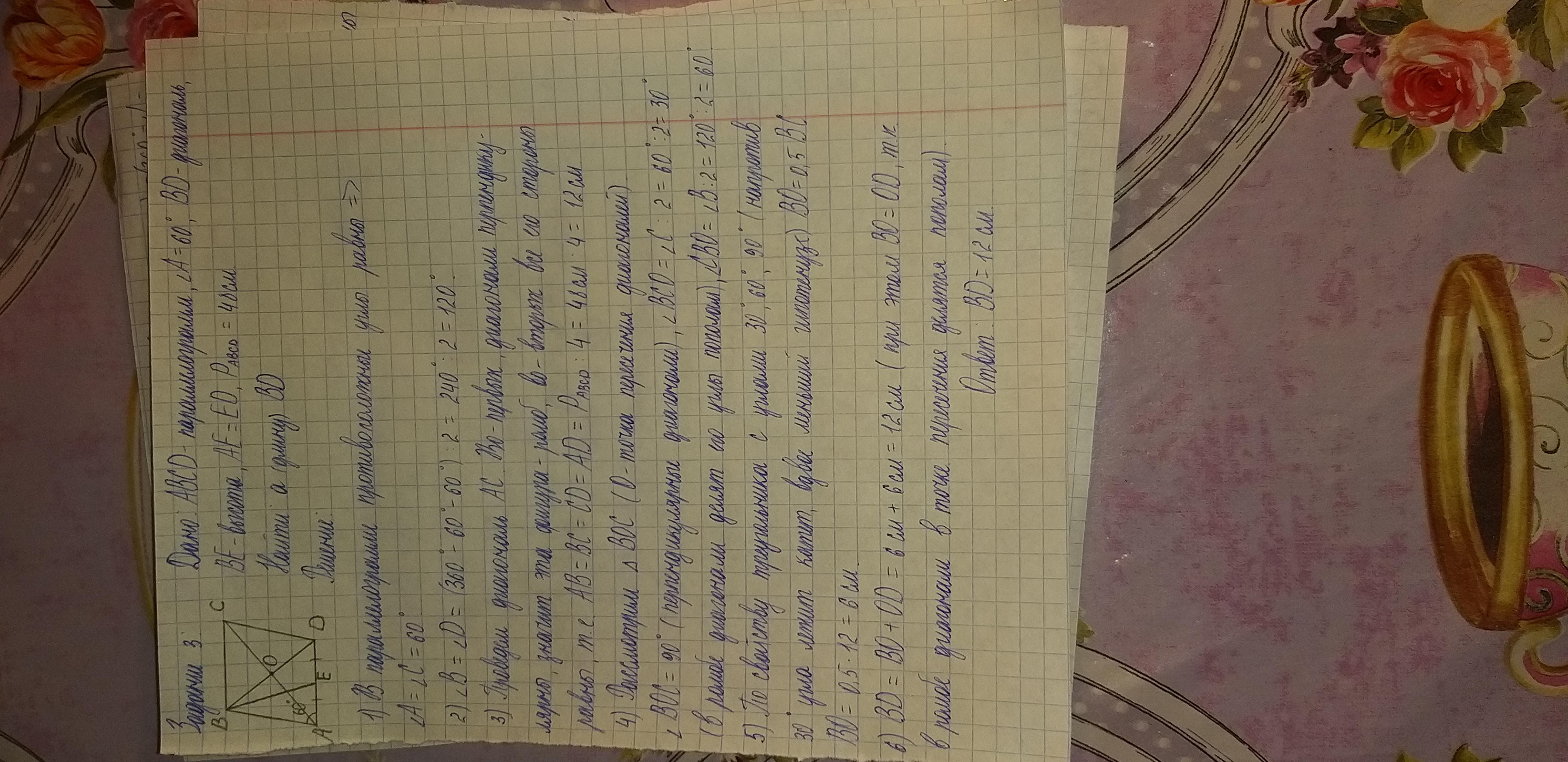 в параллелограмме ABCD угол A равен 60 градусов Высота высота BH делит сторону AD на две равные части Найдите длину диагонали BD если периметр параллелограмма равен 48 см