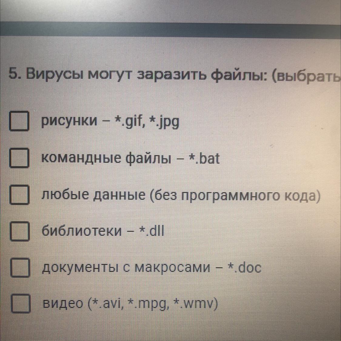 5. Вирусы могут заразить файлы: (выбрать 3 правильных ответа) *