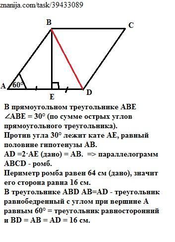 В параллелограмме ABCD угол A = 60 градусов, высота BE делит сторону AD на две равные части. Найдите длину диагонали BD, если периметр параллелограмма равен 64 см