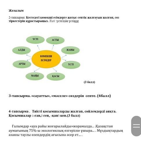 Ответ:Үстелдің астфнда үйдің жанында иттің қасында оттың маңайында машинаның артында допьың үстінде қораптың алдында. жорамалдаған. Ұшыраған. Әсер еткен