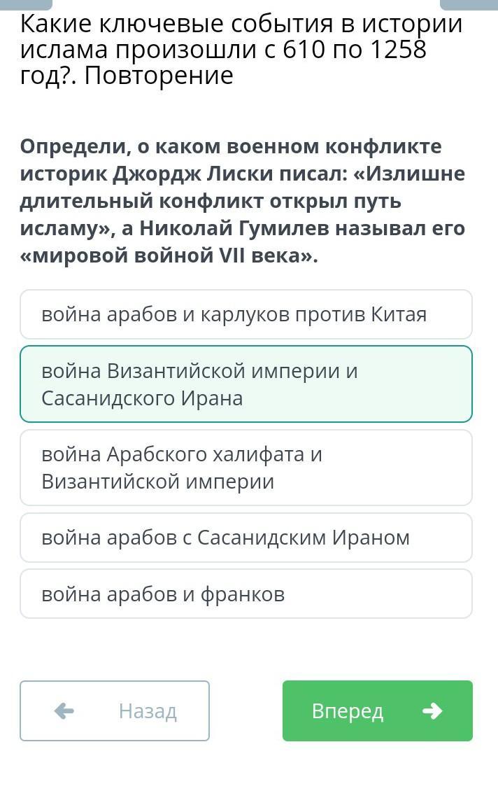 Определи, о каком военном конфликте историк Джордж Лиски писал: «Излишне длительный конфликт открыл путь исламу», а Николай Гумилев называл его «мировой войной VII века».