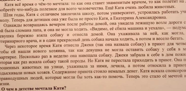 Катя в детстве мечтала стать врачом, помогать людям но детские мечты способны меняться по мере взросления и она стала учителем. Однажды на девушку повлияла несчастная ситуация случившаяся с собакой. Теперь Катя занимается волонтерством и помогает приютам для собак. Я считаю, она сделала правильный выбор.