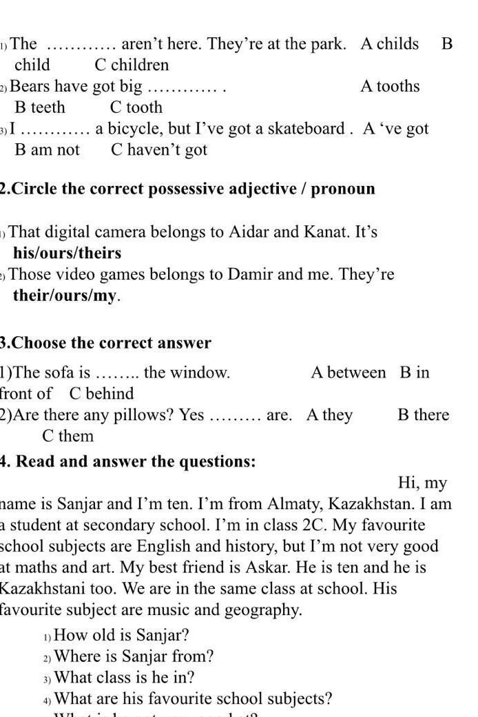 4 задание: 1. Sanjar is ten years old. 2. He is from Almaty, Kazakhstan. 3. He's in 2C class 4. He's favourite school subjects are maths and art