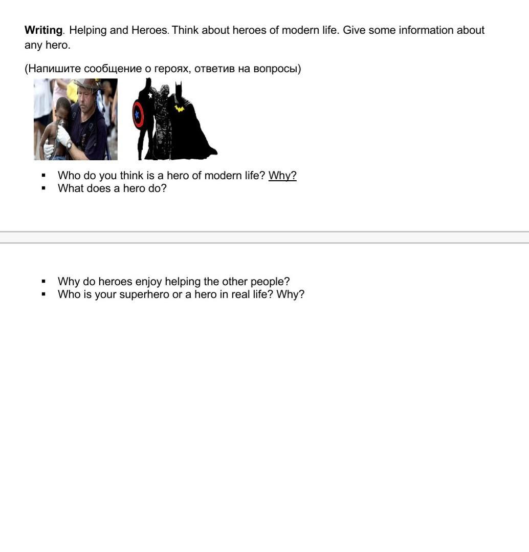 Writing. Helping and Heroes. Think about heroes of modern life. Give some information about any hero.