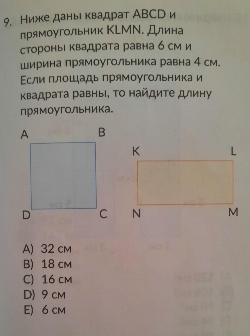 это Д) 9 см, так как 6*6=36, если площадь у обоих равна то 36=4*х х=36:4=9см-длина