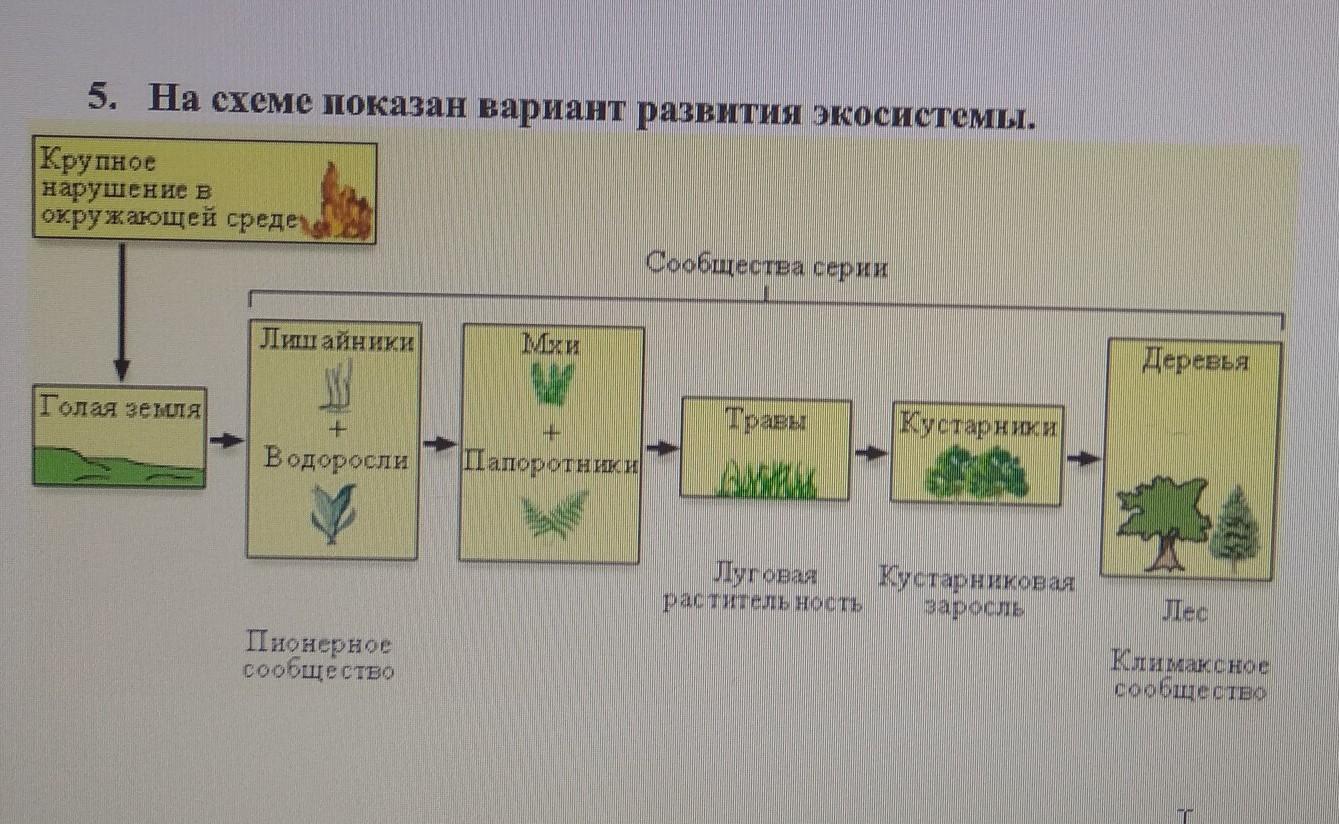 5.На схеме показан вариант развития экосистемы. Определите тип сукцессии и ее характеристики.A.Первичная сукцессия.B.Вторичная сукцессия.C.Развитие сообщества начинается на бесплодной почве.D.Начинается с медленного процесса восстановления исходного состояния на месте экосистемы,у которой нарушена природная структура.E.Первоначально поселяются лишайники и мхи.F.Почва сформировала и поэтому изначально могут произростать мелкие травы.G.Примерами является лес,который вырос на месте заросшего водоёма.H.Примером является сообщество возникшее на скальной породе.