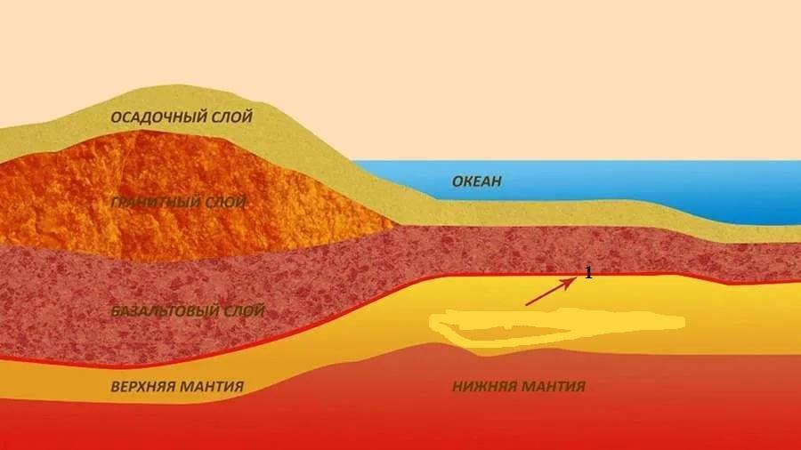 Определите часть земной коры, обозначенную цифрой «1» на схеме «Строение земной коры»