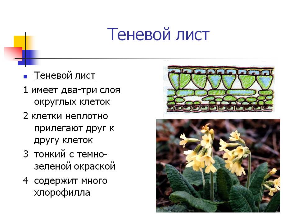 Структура теневых листьев приспособлена к возможно полному использованию слабого, рассеянного света.