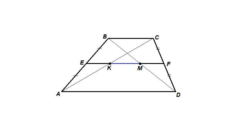 Стоит запомнить: отрезок, соединяющий середины диагоналей трапеции, равен полуразности оснований.