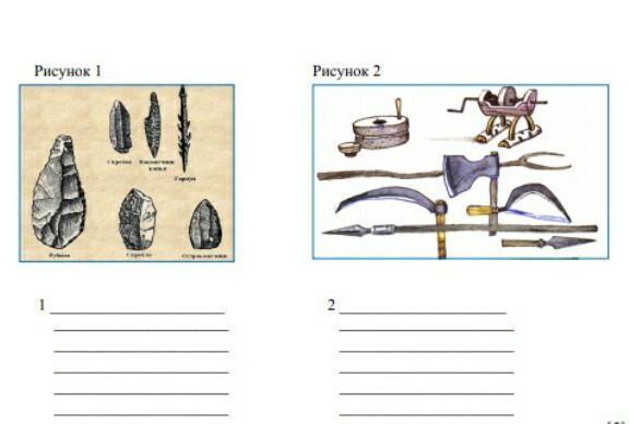 на первом рисунке каменные инструменты,на 2-ом железные инструменты