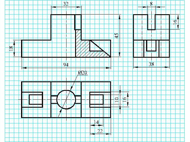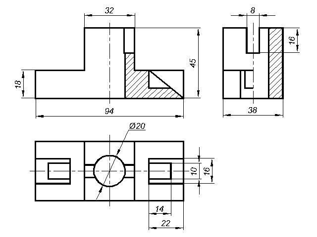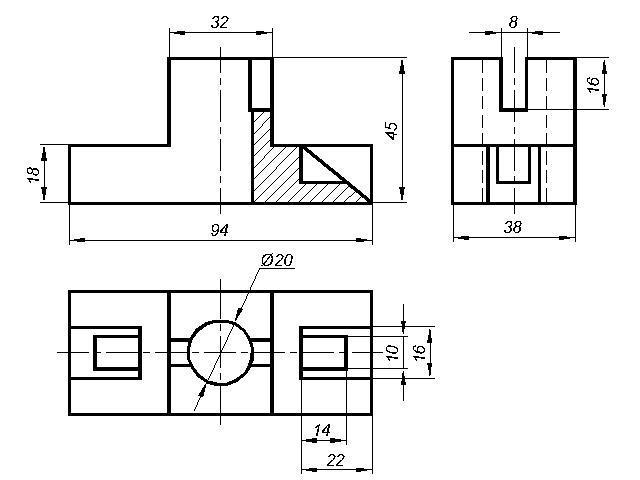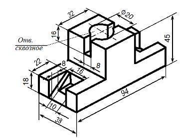 Нужно изобразить деталь в трёх видах, желательно в размерах! И выполнить разрезы, помогите пожалуйста!