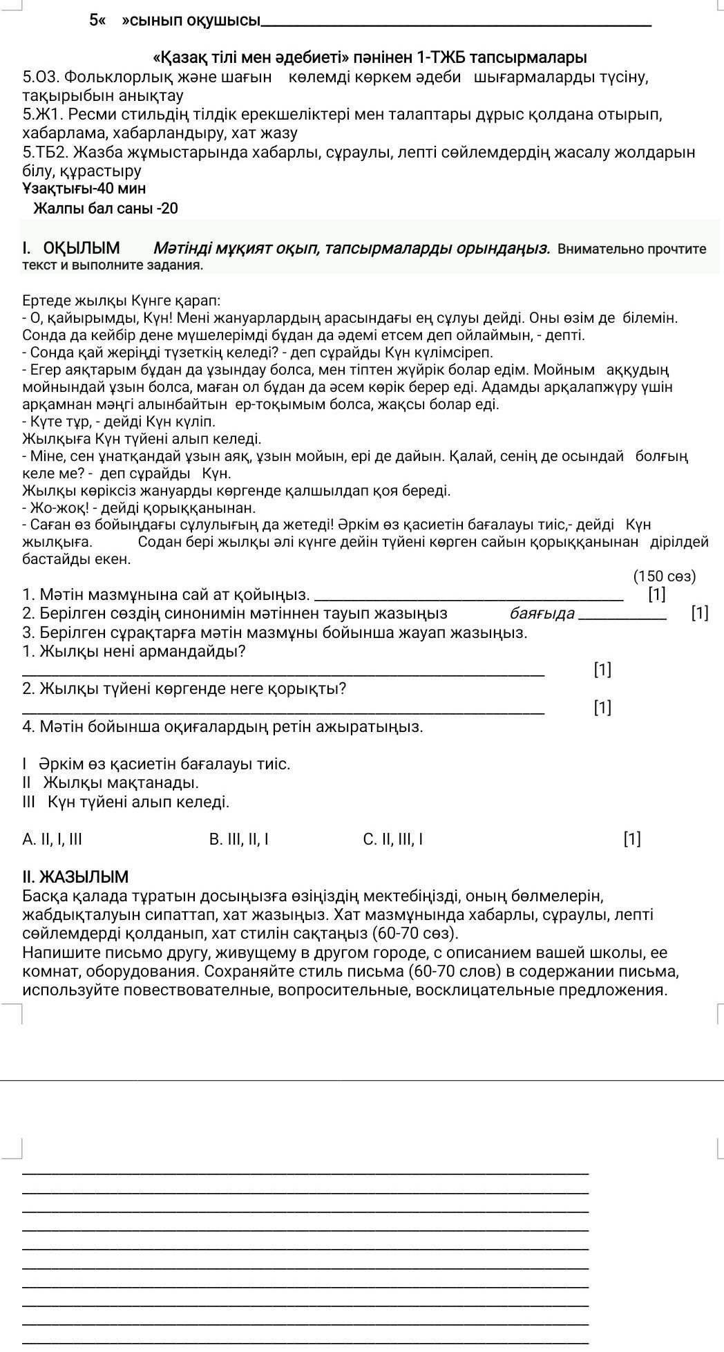 5.Сәлем досым! Қалың қалай? Мен (сюда пишите номер вашей школы) мектебінде, (сюда пишите в каком классе вы учитесь) сыныбында оқимын.Менің мектебімде өте көп кабинеттер бар.Олардың ішіне химия, физка кабинеттері жатады.Тағы менің мектебімде үлкен спорт зал бар.Спортзалда біз жаттығулар жасаймыз, көптеген ойындар ойнаймыз.