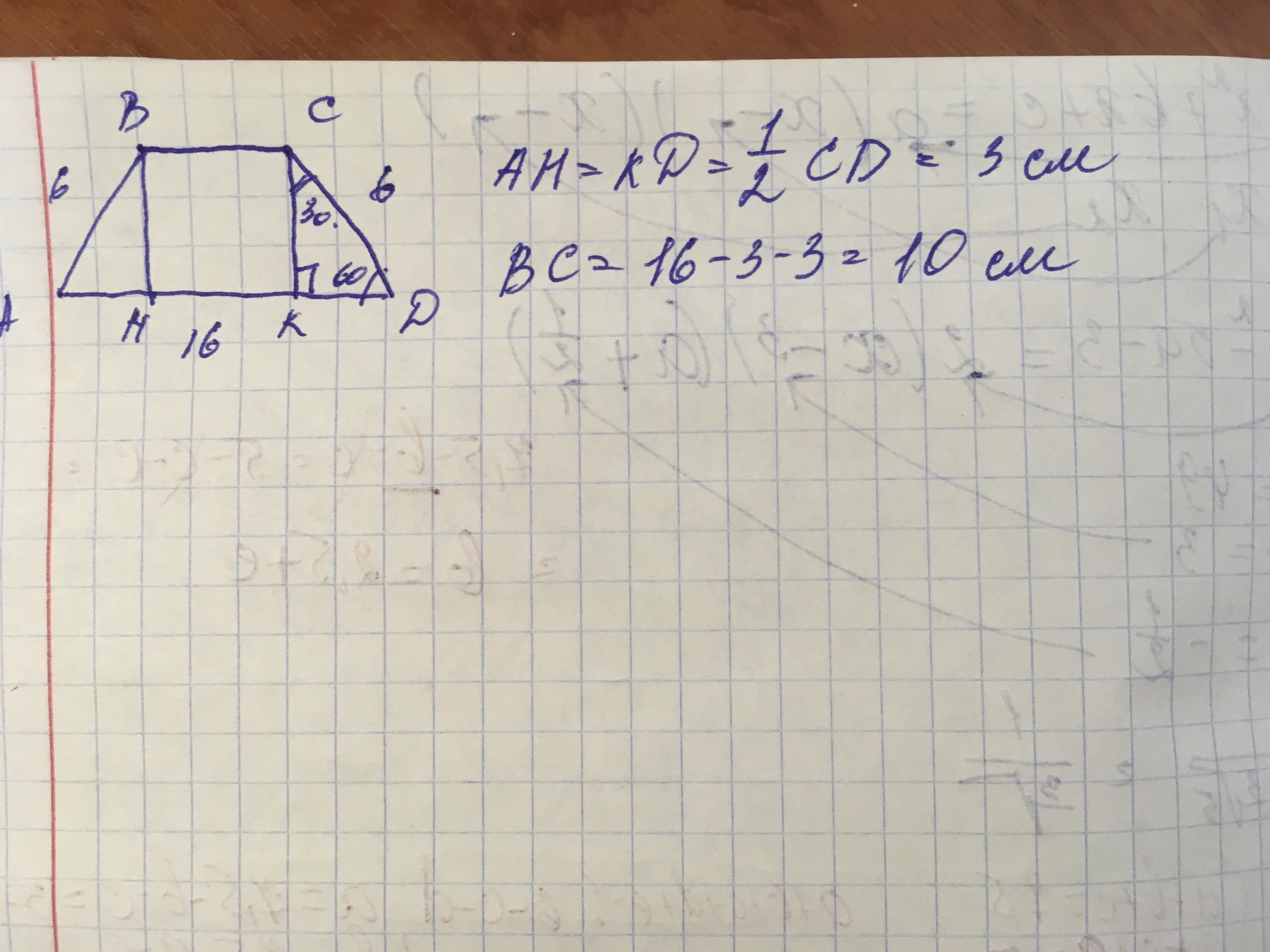 в равнобокой трапеции большее основание равно 16 см Боковая сторона равна 6 см а угол между ними 60 градусов. Найдите меньшее основание