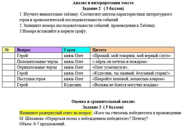 Анализ и интерпретация текста Задание 2 ( 5 баллов) 1. Изучите внимательно таблицу. Соотнесите онтаты-характеристики литературного героя в хронологической последовательности событий 2 Запишите номера последовательности событий произведения и Таблицу 3. Номера вставляйте в первую графу Цитата «Прошай мой товарищ, мой верный слуга" Вопрос Герои Герой кини. Олег Положительные черты князь Олег «обреконыечтами пожарам» тельные черты князь Олег «Олег усмехнулся», Герой Поступки героя Герой князь Олег «Кудесник, ты лживый безумный старик!» князь Олег "Покройте попоной, мохнатым ковром" Кудесник. "Волхвы боятся могутих владык" Оценка и сравнительный анализ Задание 3 (5 баллов) Напишите развернутый ответ на вопрос: «Кого ты считаешь победителем в произведении М. Шаханова "Отрарская поэма о побежденном победителе»? Почему? Объем б-7 предложений