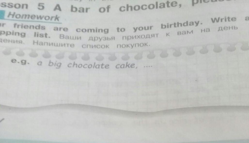 ваши друзья преходет к вам на день рожденья напишите список покупок .на англиском языке .пж .с переводом еще на руский