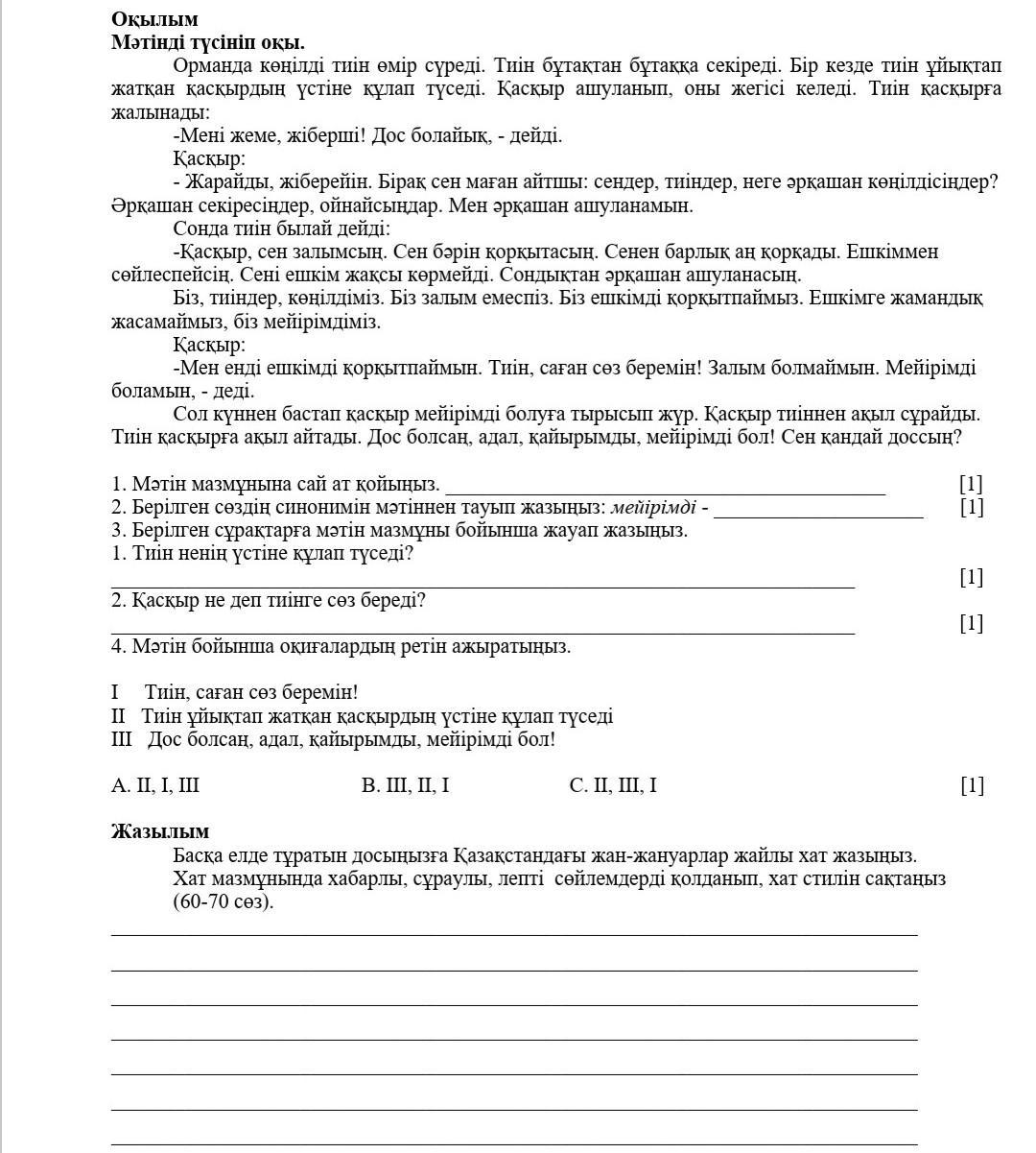 2. Берілген сөздің синонимін мәтіннен тауып жазыңыз: мейірімді - ____________________ [1]