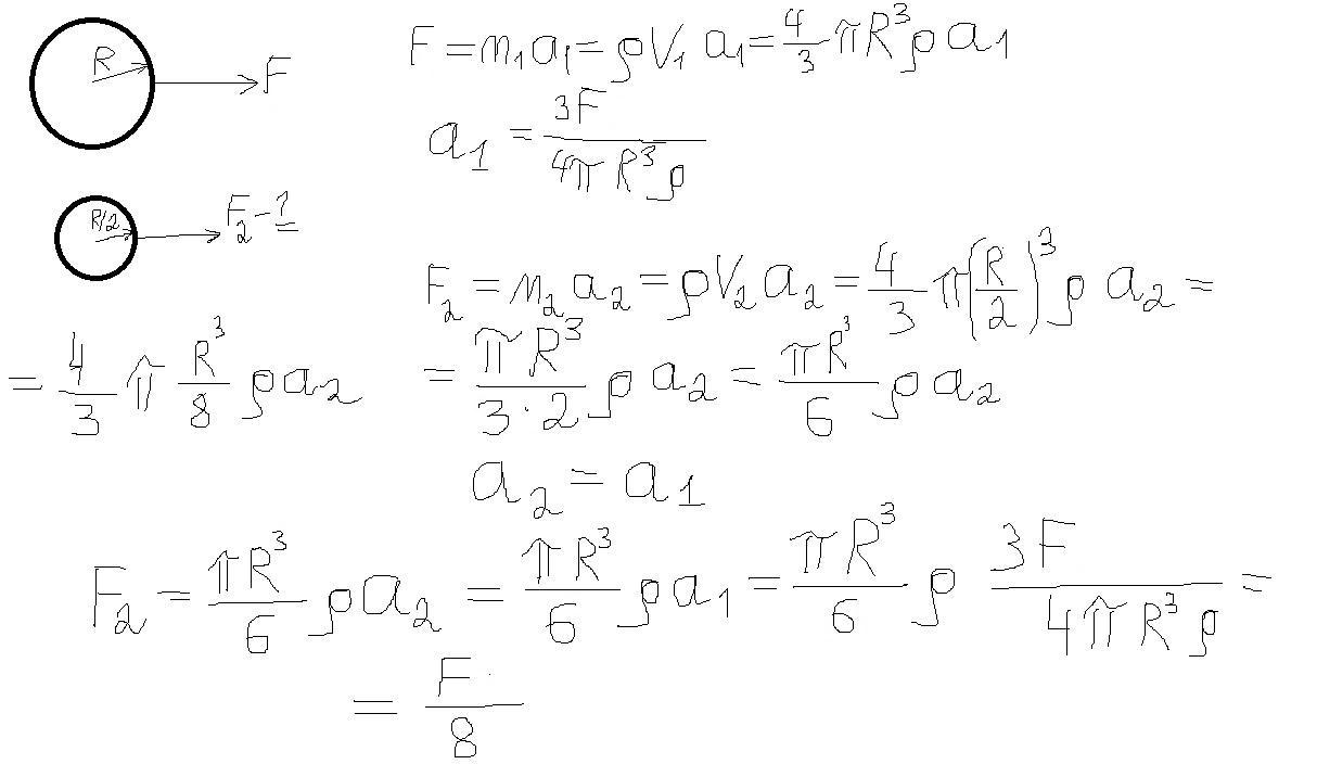 Сила F действующая на стальной шар радиуса R сообщает ему некоторое ускорение.Какая сила сообщит такое же ускорение стальному шару радиуса R/2?