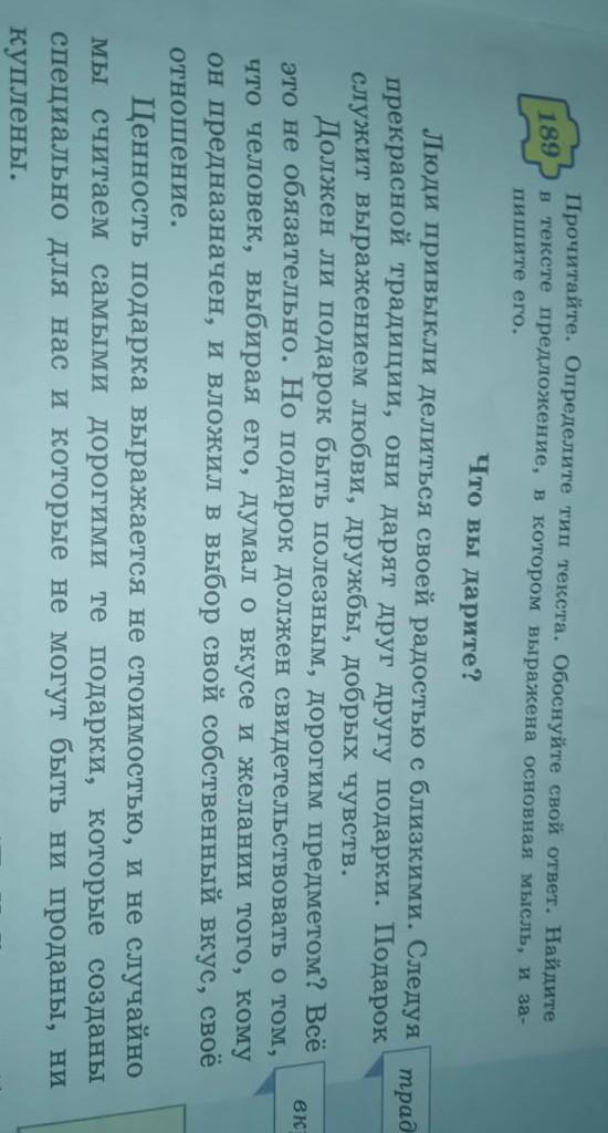 Основная мысль текста: Подарок должен свидетельствовать о том, что человек выбирая его думал о вкусе и желании того, кому он предназначен, и вложил в выбор свой собственный вкус, своё отношение. Ценность подарка выражается не стоимостью!