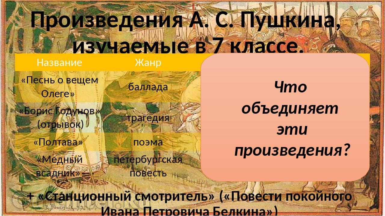 медный всадник песнь о вещем олеге станционный смотритель борис годунов что "объединяет" эти произведения