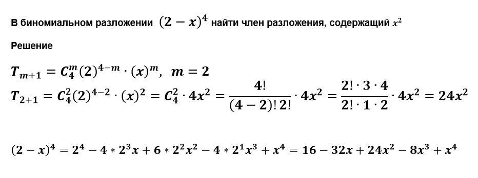 коэффициент при х^2 в биноминальном разложении (2-х)^4 равен 24