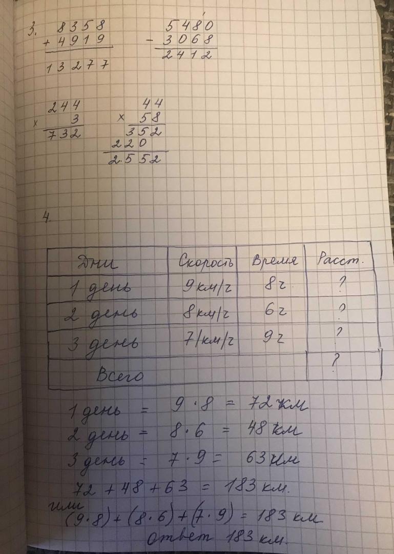 4. Караван верблюдов шёл в первый день 8ч со скоростью 9 км/ч во второй день - 6ч со скоростью 8 км ч а в третий день - 9ч со скоростью 7 км ч. Какое расстояние прошёл караван за 3 дня?