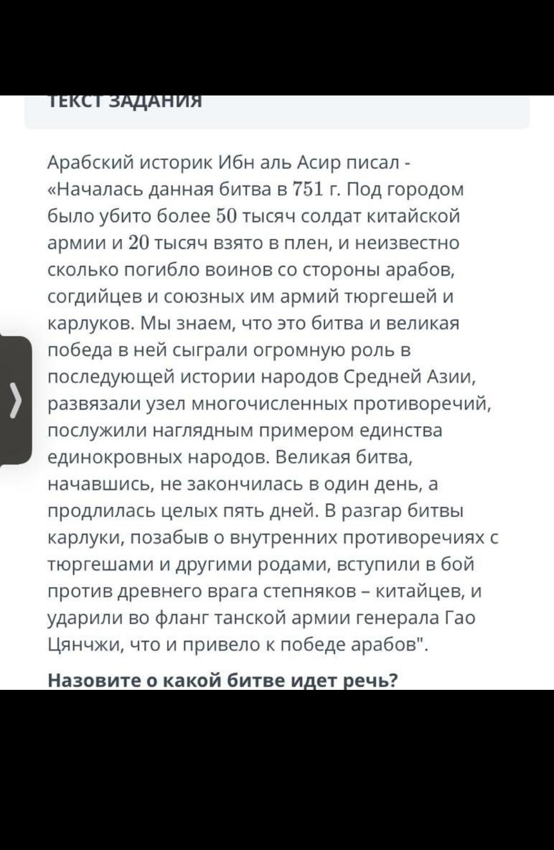 сражение, произошедшее в июле 751 года на реке Талас (предположительно в приграничных районах современных Казахстана и Кыргызстана) у города Атлаха между войсками Аббасидской империи и Карлукского каганата с одной стороны, и армией танского Китая за контроль над Средней Азией.
