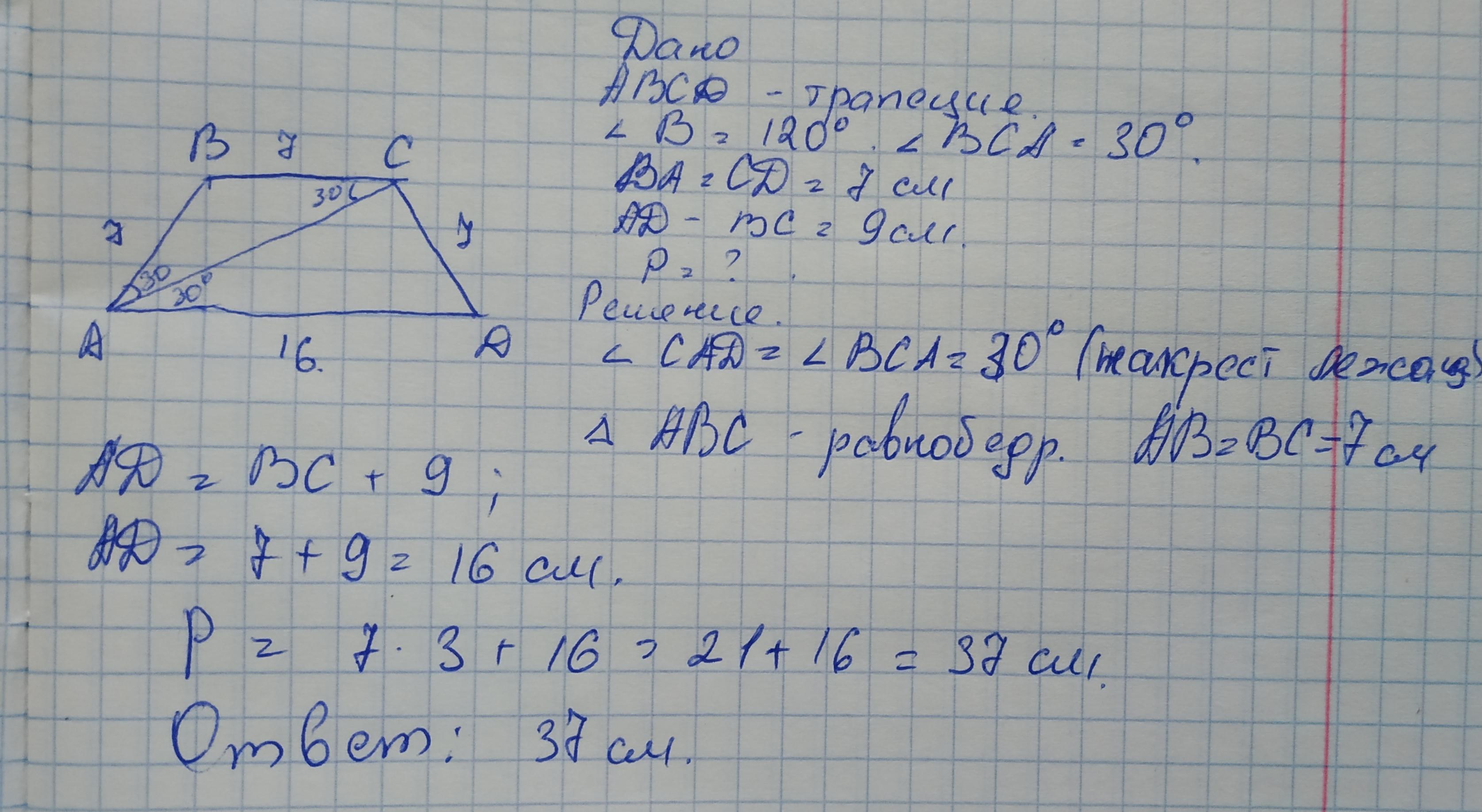 . Найдите периметр трапеции, если ее боковая сторона 7см, а