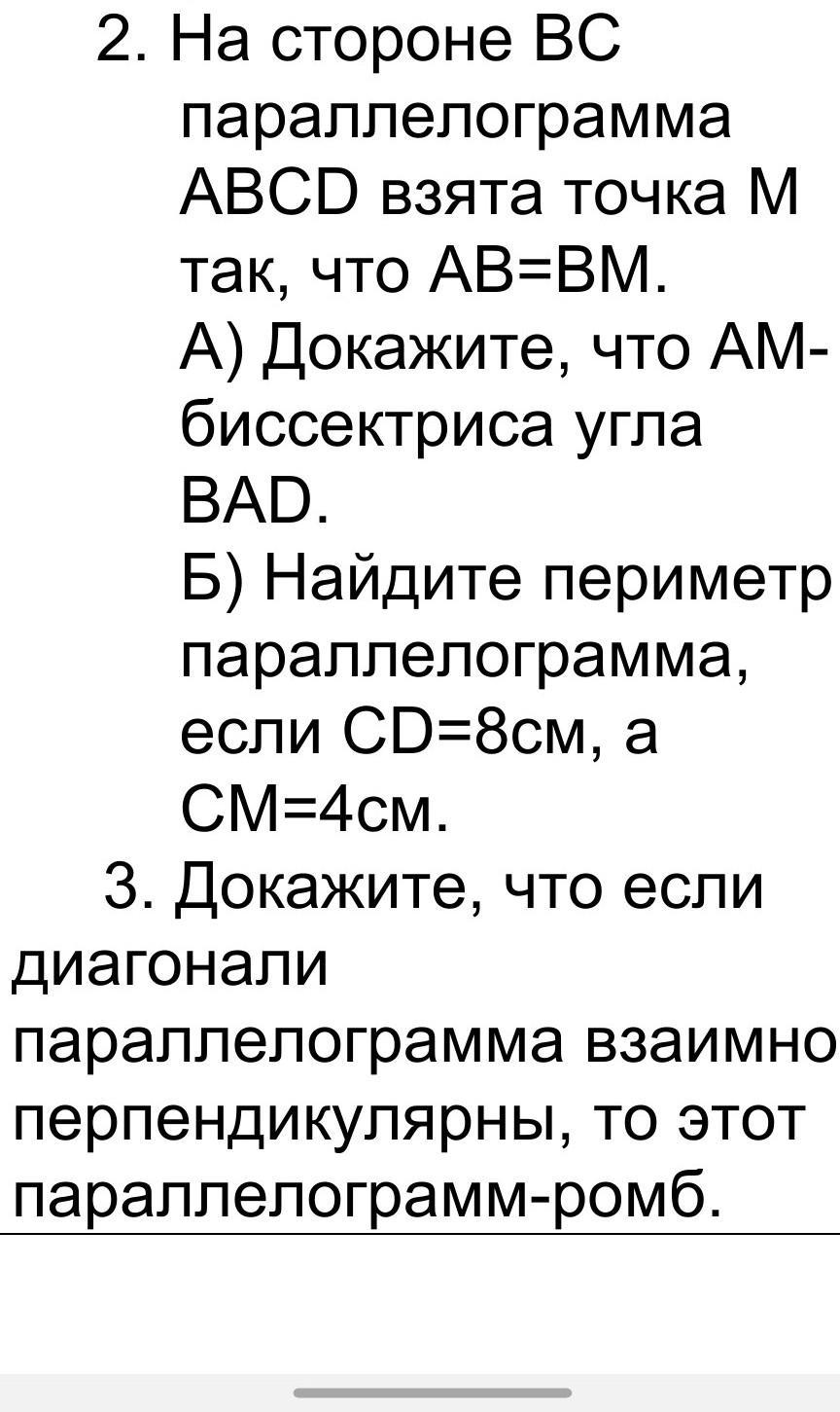 1.По условию нам дано, что AB=BM. Следовательно ΔABM равнобедренный. А из свойств биссектрисы параллелограмма: Биссектриса угла параллелограмма отсекает от него равнобедренный треугольник ⇒ AM биссектриса