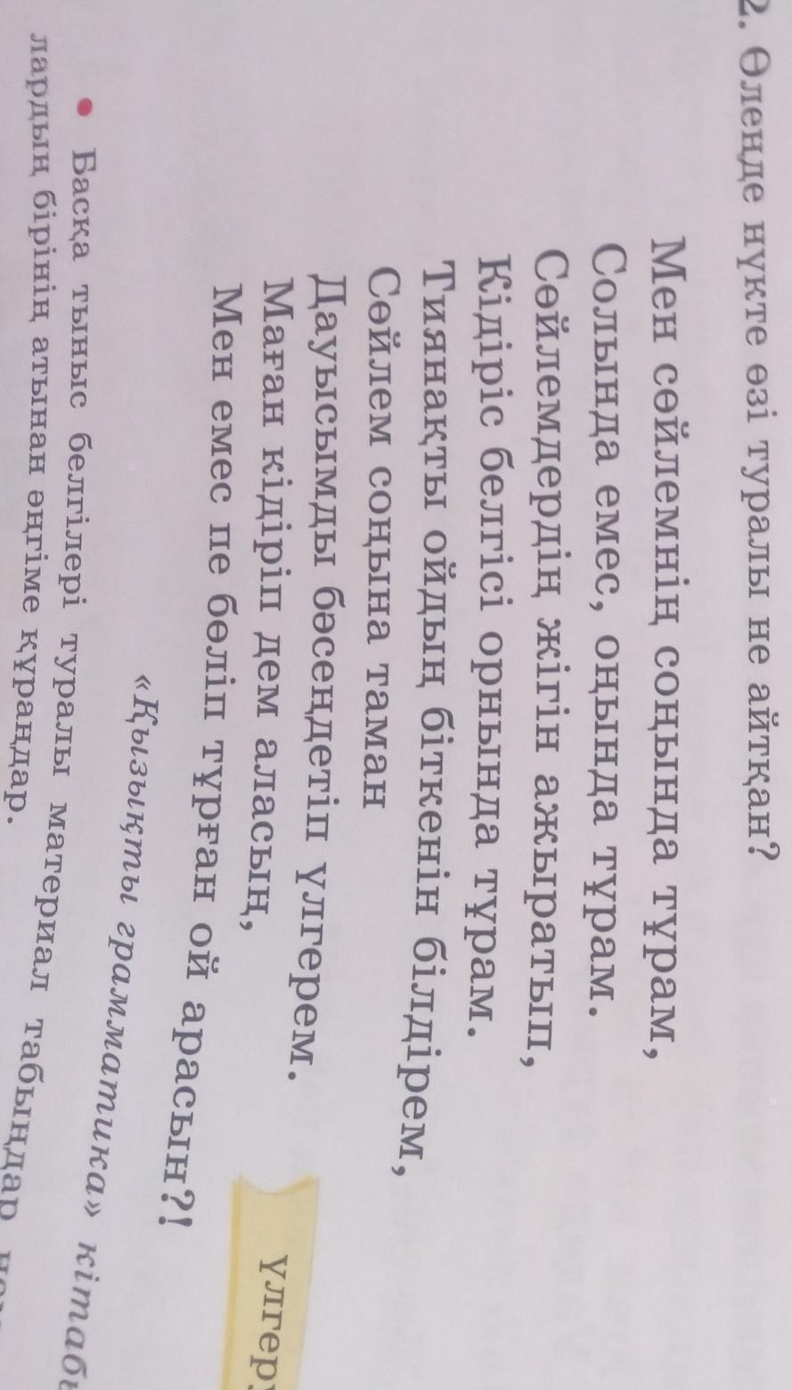 Бір күні үтір орнынан тұрып нүктеге"Нүкте-сен сөйлемнің соңында тұрсаңда сен арқылы сөйлемнің ойы аяқталады.Маңызың зор тыныс белгісін"дейді.Дефис ұялып қалады,нүктеге барып кешірім сұрайды.Нүкте оны кешіріп бәрі әңгімелер айтып дастарханға отырады.