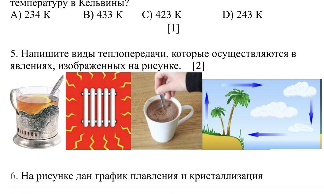 5.Напишите виды теплопередачи, которые осуществляются в явлениях, изображенных на рисунке