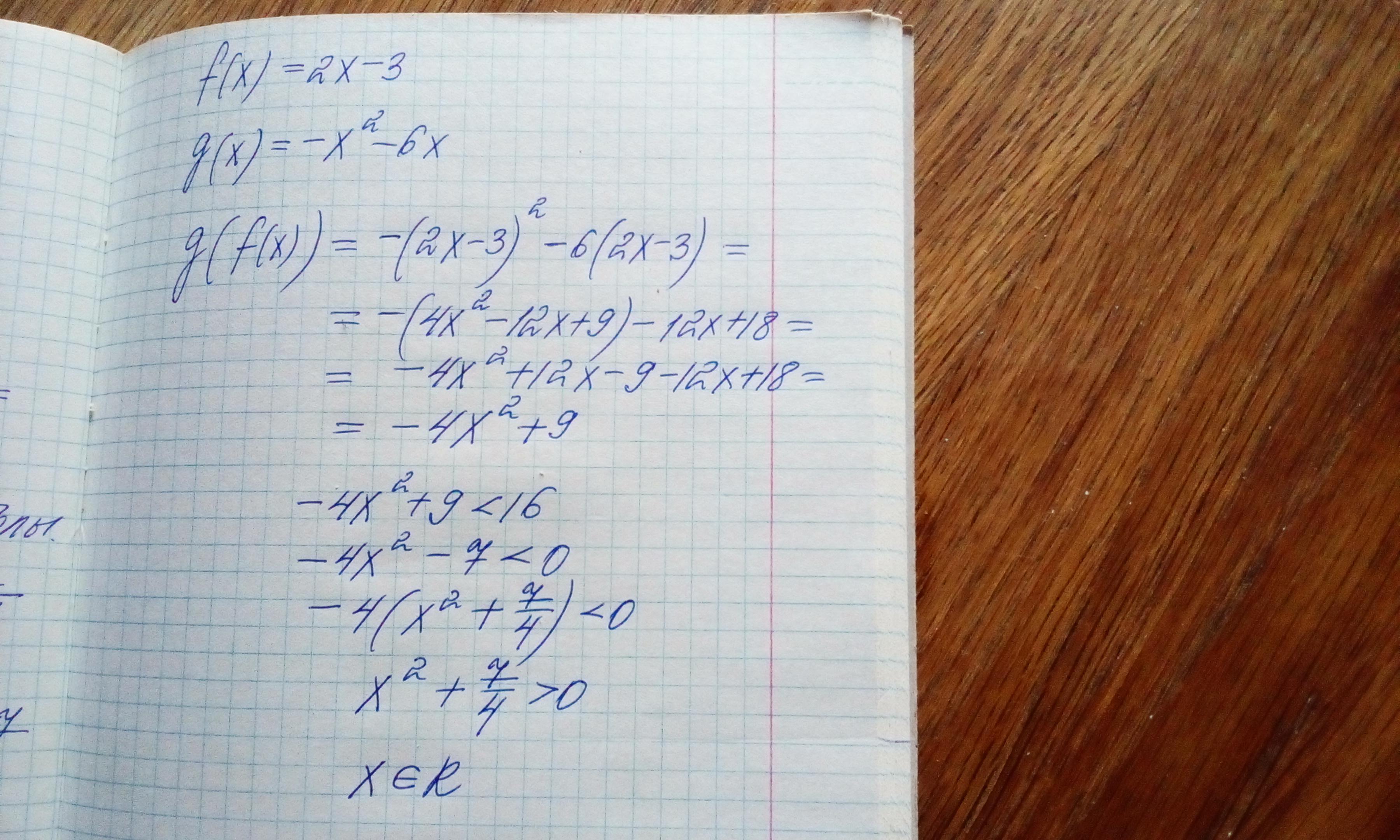постройте композицию сложных функций,решить неравенства f(x)=2x-3,g(x)=-x^2-6x,g(f(x))<16 ответ