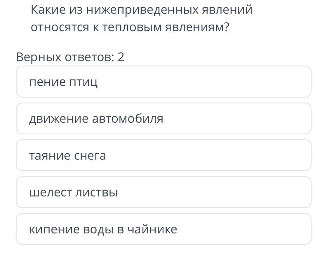 Какие из нижеприведенных явлений относятся к тепловым явлениям? Верных ответов: 2 пение птиц движение автомобиля таяние снега шелест листвы кипение воды в чайнике