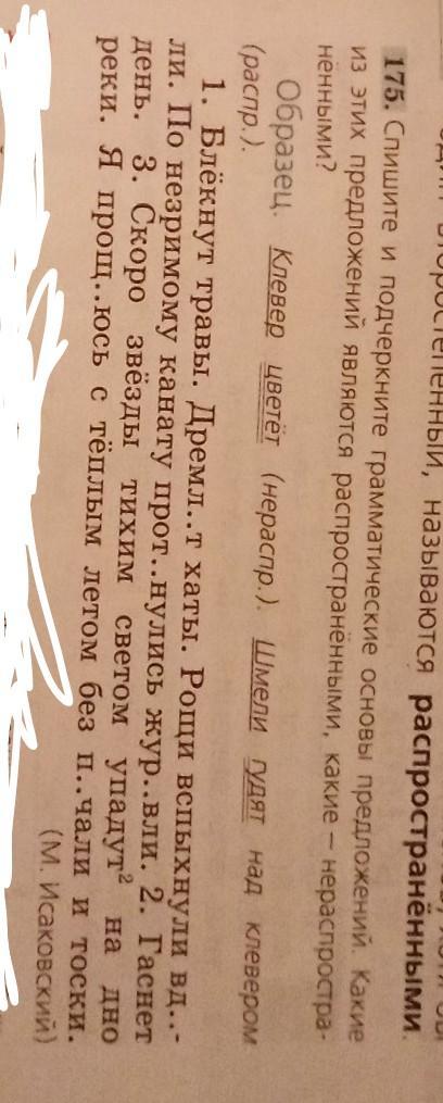 1Блекнут(сказуем) травы(подлеж) НЕРАСПР. 2Дремлют(сказуем) хаты (подлеж) НЕРАСПР. 3Рощи(подлеж) вспыхнули(сказуем) вдали РАСПР. 4По незримому канату протянулись(сказуем) журавли (подлеж) РАСПР. 5Гаснет день НЕРАСПР. 6 Скоро звезды(подлеж) тихим светом упадут(сказуем) на дно реки РАСПР. 7 Я(подлеж) прощаюсь(сказуем) с тёплым летом без печали и тоски. РАСПР