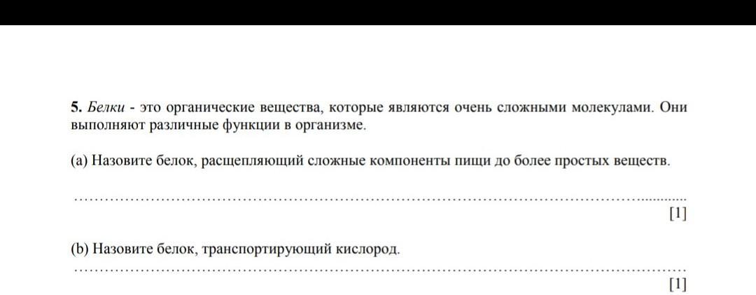 5. Белки это органические вещества, которые являются очень сложными молекулами. Они выполняют различные функции в организме. (а) Назовите белок, расщепляющий сложные компоненты пишщи до более простых веществ. (b) Назовите белок, транспортирующий кислород.