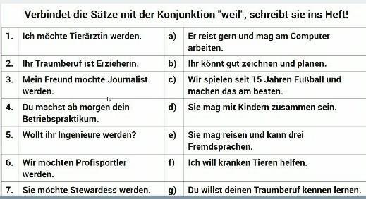 4.Du machst ab morgen dein Betriebspraktikum,weil du deinen Traumberuf kennen lernen wilst.