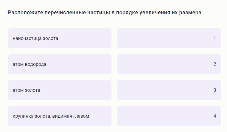 наночастица золота-2, атом водорода- 3,атом золота-1, крупинка золота, видимая глазом-4