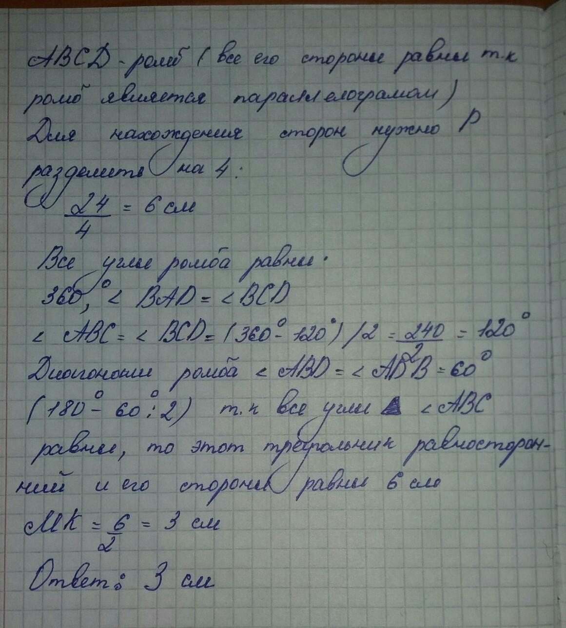 Периметр ромба ABCD равен 24 см, угол A=60 °. Найдите среднюю линию MK треугольника ABD, где M €AB, K € AD